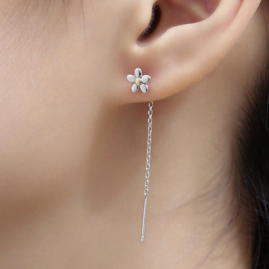 Sterling Silver Tiny Forget Me Not Flower Ear Threaders, Two Tone Flower Threader Earrings, Daily Dangle Earrings, Daisy Earrings