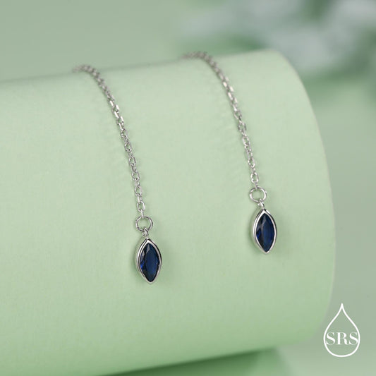 Tiny Sapphire Blue Marquise CZ Threader Earrings in Sterling Silver, Silver or Gold, Marquise Cut CZ Ear Threaders, Sparkly Threaders