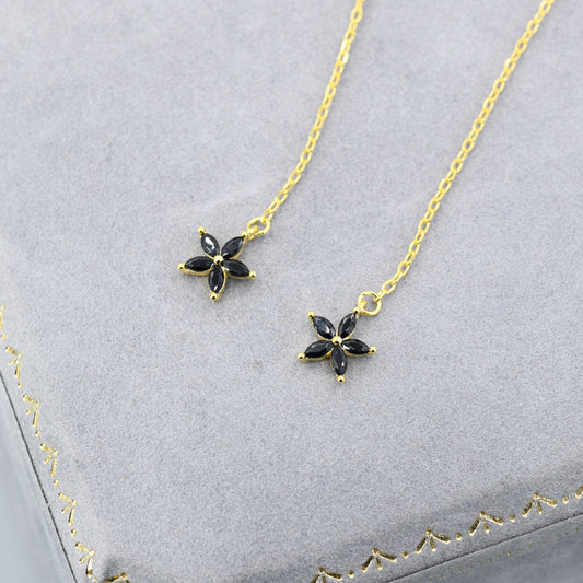 Black CZ Flower Threader Earrings in Sterling Silver, Silver or Gold, Forget-me-not Floral Ear Threaders, Sparkly CZ Threaders
