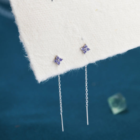 Purple Hydrangea Flower CZ Threader Earrings in Sterling Silver, Silver or Gold, Four Dot Crystal Ear Threaders, Flower CZ Earrings