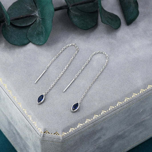 Tiny Sapphire Blue Marquise CZ Threader Earrings in Sterling Silver, Silver or Gold, Marquise Cut CZ Ear Threaders, Sparkly Threaders