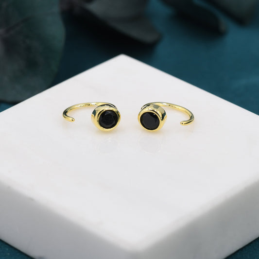 Black 4mm CZ Huggie Hoop Earrings in Sterling Silver, Tiny CZ Open Hoops, Pull Through Threaders, Half Hoops, C Shape