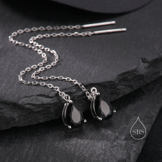 Black CZ Droplet Threader Earrings in Sterling Silver, Silver or Gold, 5x7mm Pear Cut CZ Long Ear Threaders, Sparkly CZ Threaders