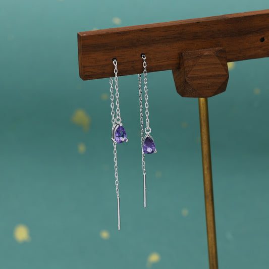 Amethyst Purple CZ Droplet Threader Earrings in Sterling Silver, Silver or Gold, Pear Cut 4x6mm CZ Long Ear Threaders, Sparkly CZ Threaders