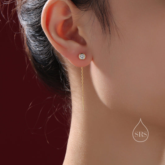 Delicate 4mm Bezel CZ Crystal Threader Earrings in Sterling Silver, Silver or Gold, Minimalist Pear Cut Crystal Ear Threaders