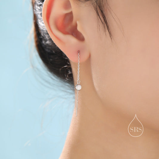 Sterling Silver Tiny White Opal Coin Ear Threader Earrings, Silver or Gold, Lab Opal Drop Earrings, Geometric Minimalist Threader Earrings