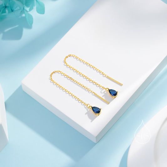 Sapphire Blue Droplet CZ Threader Earrings in Sterling Silver, Silver or Gold, Tiny Pear Shape Crystal Ear Threaders, Prong Set CZ Earring