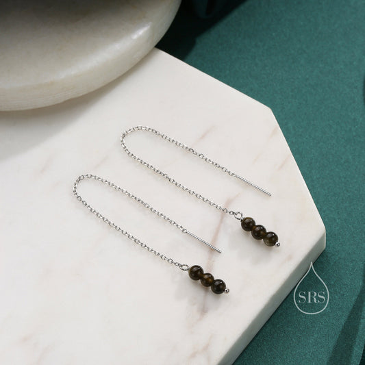 Genuine Gold Obsidian Threaders in Sterling Silver, Three Beads Threader Earrings, Ear Jacket, Gold Obsidian Earrings
