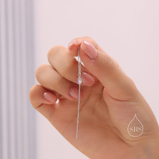 Extra Tiny Moonstone Droplet Long Threader Earrings in Sterling Silver, 3x4mm Pear Shape Lab Moonstone, Silver or Gold or Rosegold