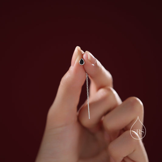 Tiny Black Droplet Bezel CZ Crystal Threader Earrings in Sterling Silver, Silver or Gold, Minimalist Pear Cut Ear Threaders