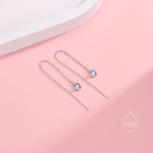 Sterling Silver Tiny Moonstone Coin Ear Threader Earrings, Silver or Gold, Lab Moonstone Drop Earrings, Minimalist Threader Earrings