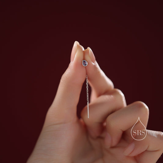 Tiny Amethyst Purple Droplet Bezel CZ Crystal Threader Earrings in Sterling Silver, Silver or Gold, Minimalist Pear Cut Ear Threaders