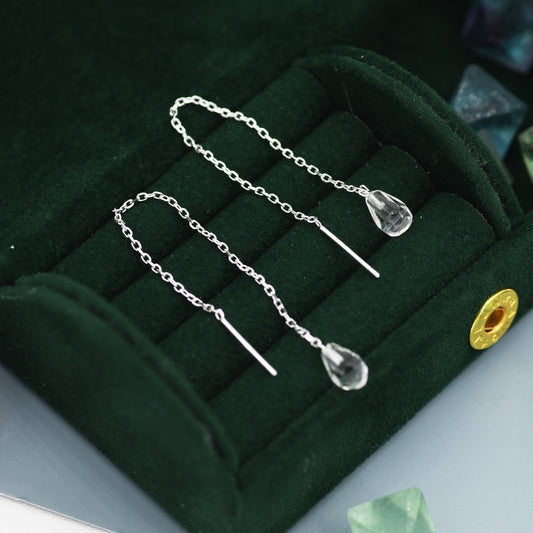 Genuine Clear Quartz Crystal Threader Earrings in Sterling Silver, 8cm Ear Threaders, Faceted Droplet, Natural Gemstone Ear Threaders