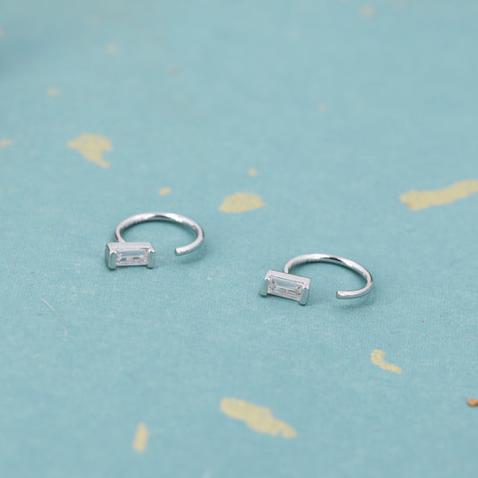 Vertical Baguette Cut CZ Huggie Hoop Earrings in Sterling Silver, Silver or Gold, Open Hoops, Pull-Through Threader Earrings