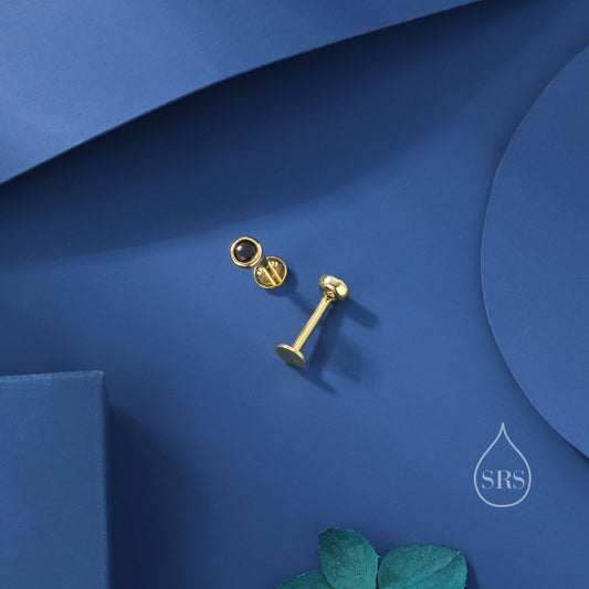 Black CZ Internally Threaded Flat Back / Screw Back /Stud Earrings in Sterling Silver,4mm CZ, Black CZ Barbell Earrings, Silver or Gold