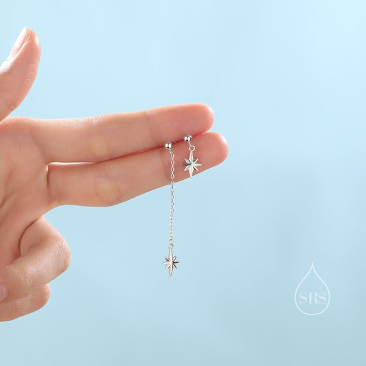 Minimalist Shooting Star Drop Stud Earrings in Sterling Silver, Silver or Gold or Rose Gold, Tiny Starburst Chain Dangle Earrings