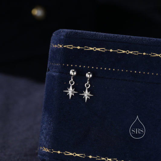 Tiny CZ Starburst Drop Stud Earrings in Sterling Silver, Silver, Gold or Rose Gold, North Star Earrings, Sunburst Earrings, Tiny Star Stud