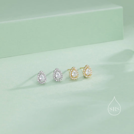 Tiny Droplet CZ Halo Stud Earrings in Sterling Silver, Silver or Gold, Tiny Pear Cut CZ Stud Earrings