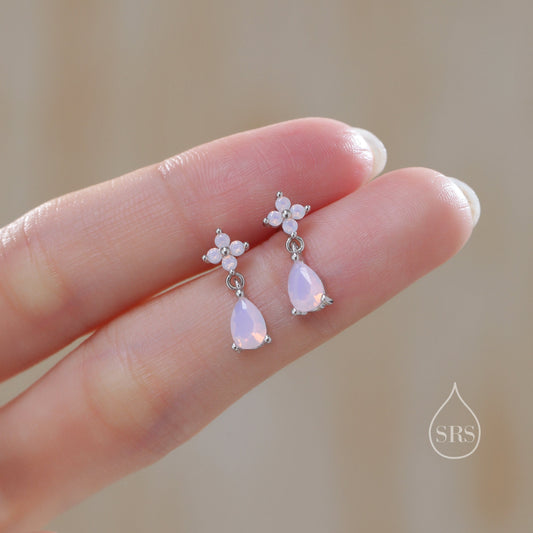 Sterling Silver Four CZ and Droplet Stud Earrings with Opal Pink CZs, Silver or Gold, Hydrangea CZ Earrings with Pong Set Dangle Dropet