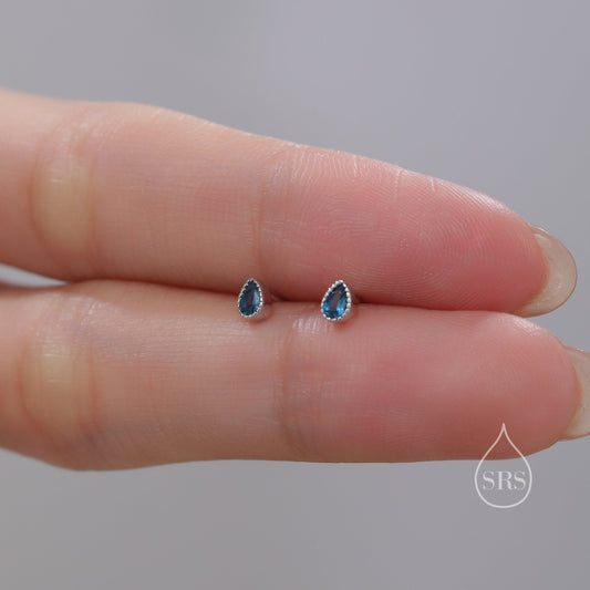Tiny Droplet London Blue CZ Stud Earrings in Sterling Silver, Silver or Gold, Pear Cut CZ Stud Extra Tiny Dotted Bezel Vintage Inspired