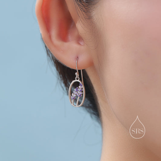 Sterling Silver Lavender Drop Hook Earrings, Handpainted Enamel Lavender Earrings, Silver or Gold, Purple Lavender Earrings