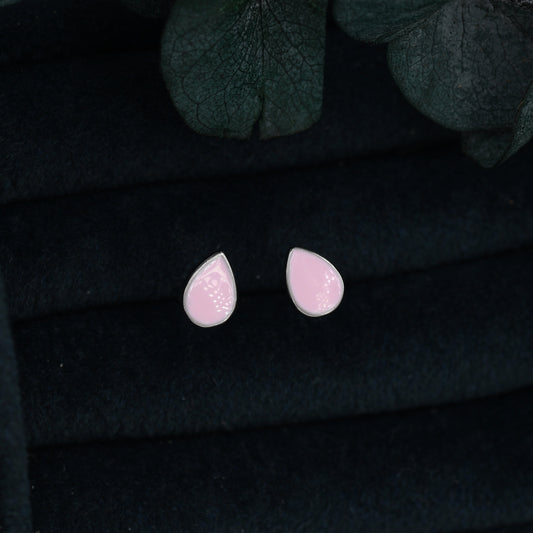 Pink Droplet Dot Stud Earrings in Sterling Silver with Hand Painted Enamel, Pastel Pink Stud, Enamel Droplet, Drop Shape
