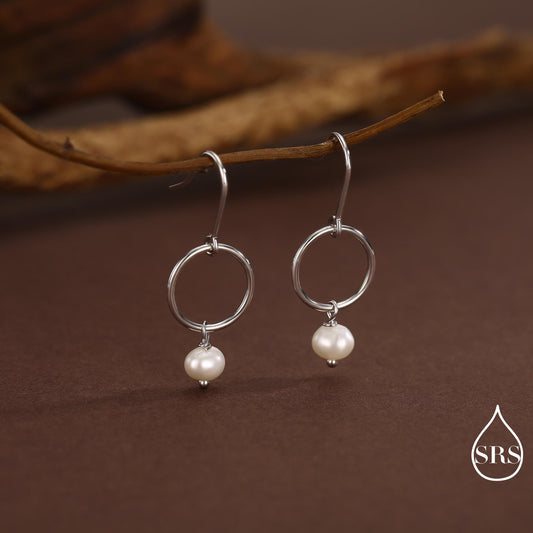 Genuine Freshwater Pearl and Circle Dangle Drop Earrings in Sterling Silver, Delicate Keshi Pearl Halo Earrings, Also in Gold and Rose Gold
