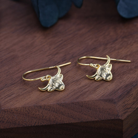 Highland Cow Drop Dangling Earrings in Sterling Silver, Silver or Gold or Rose Gold, Highland Cow Earrings, Cow Hook Earrings, Scottish