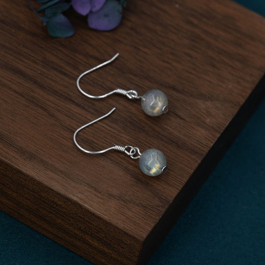 Genuine Labradorite Drop Hook Earrings in Sterling Silver, 6mm Labradorite Ball Earrings