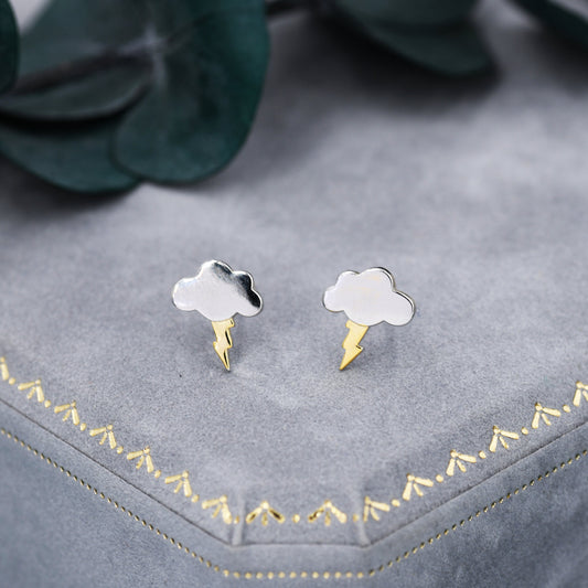 Dainty Little Cloud and Lightning Bolt Stud Earrings in Sterling Silver - Two Tone Gold and Silver Earrings - Fun, Whimsical