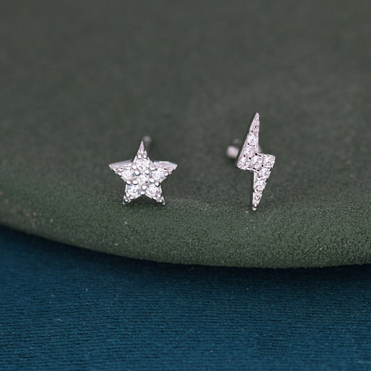Mismatched Tiny Star and Lightning Bolt Stud Earrings in Sterling Silver, Asymmetric CZ Star and Lightning Bolt Fun Earrings