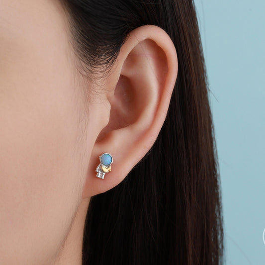 Astronaut Stud Earrings in Sterling Silver, Mismatched Astronaut Earrings, Asymmetric Spaceman Earrings, Moonstone or Opal