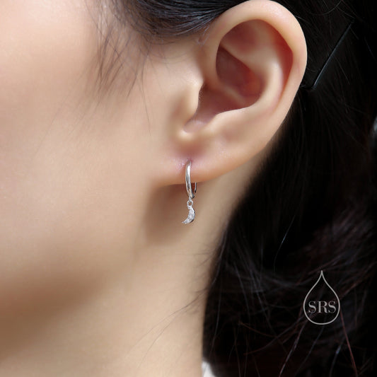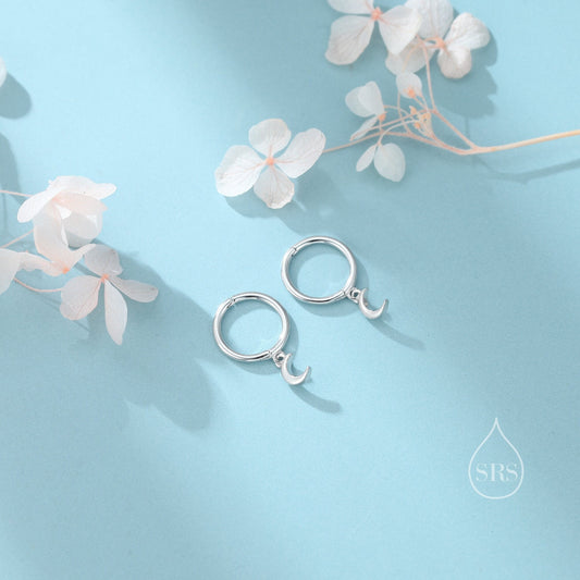 Extra Skinny Moon Dangle Huggie Hoop Earrings in Sterling Silver, Silver or Gold or Rose Gold, Moon Skinny Hoops