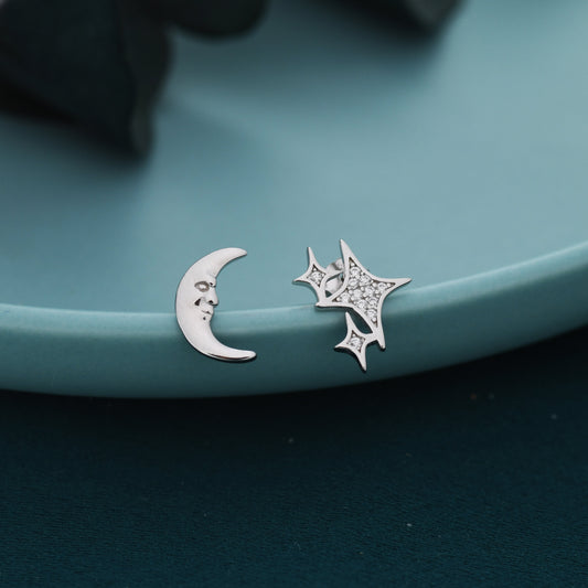 Mismatched Moon and Star CZ Stud Earrings in Sterling Silver, CZ Moon and Star Earrings, Celestial Earrings