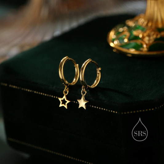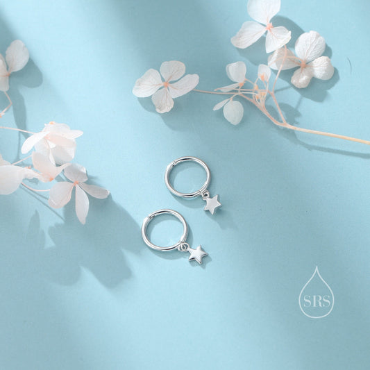 Star Dangle Huggie Hoop Earrings in Sterling Silver, Silver or Gold or Rose Gold, Delicate Star Skinny Hoops