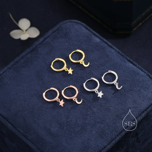 Moon and Star Dangle Huggie Hoop Earrings in Sterling Silver, Silver or Gold or Rose Gold, Moon and Star Skinny Hoops