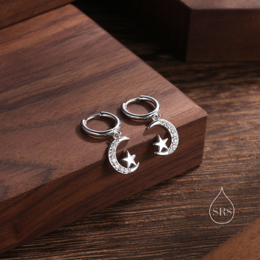 Moon and Star CZ Dangle Huggie Hoop Earrings in Sterling Silver, Silver or Gold or Rose Gold, CZ Moon and Star Hoops, Vintage Inspired