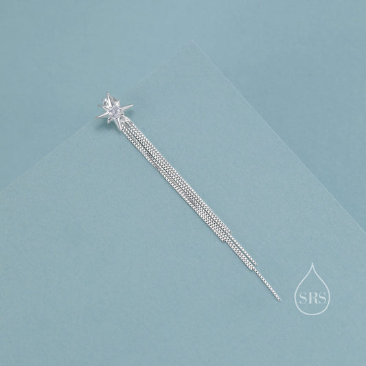 Starburst Dangle Drop Stud Earrings in Sterling Silver with Sparkle Tassels, Silver or Gold or Rose Gold, Tiny North Star Dangle Earrings