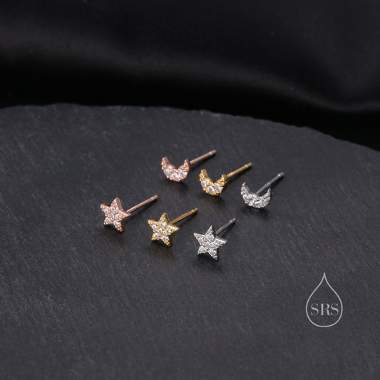 Delicate CZ Moon and Star Stud Earrings in Sterling Silver, Silver, Gold or Rose Gold, Small Moon and Starburst Earrings, Celestial Earrings