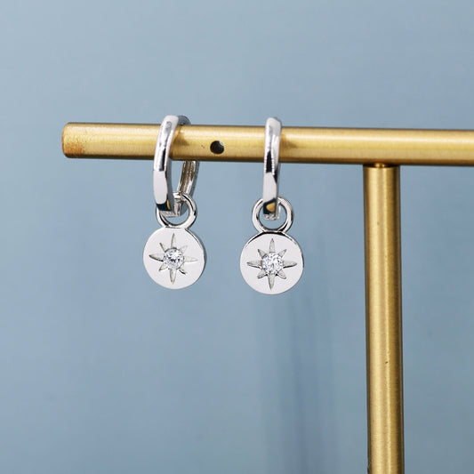 Starburst Disk Charm Huggie Hoop Earrings in Sterling Silver with Detachable Coin Charms, North Star Celestial Geometric Design