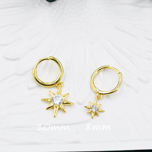 Starburst Huggie Hoop Earrings in Sterling Silver with Dangling Star Burst Charms, 8mm Silver or Gold, Single CZ, Celestial Geometric Design