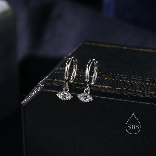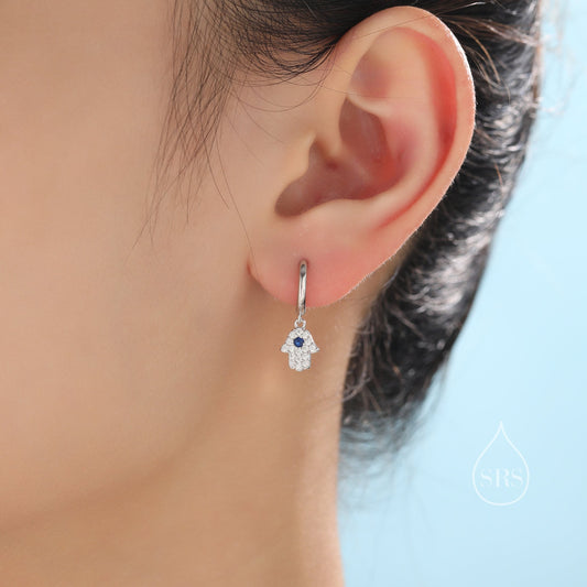 Huggie Hoop Earrings in Sterling Silver with Evil Eye Protection Charm, Hoop Earrings, Dangling, Fatima Hand