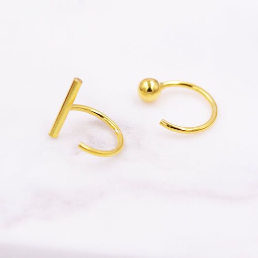 Mismatched Ball and Bar Huggie Hoop Threader Earrings in Sterling Silver, Silver or Gold, Pull Through Open Hoop Earrings