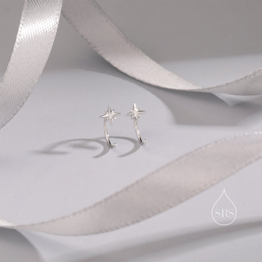 Starburst Star Huggie Hoop Earrings in Sterling Silver, Tiny North Star CZ Trio Open Hoops, Pull Through Threaders, Half Hoops