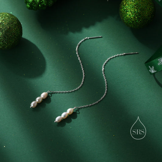Sale!Genuine Freshwater Oval Pearl Trio Threader Earrings in Sterling Silver, 9cm Ear Threaders, Long Threaders, Natural Drop Pearl Ear Threaders
