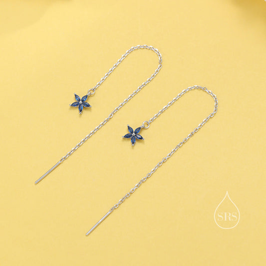Sapphire Blue CZ Flower Threader Earrings in Sterling Silver, Silver or Gold, Forget-me-not Floral Ear Threaders, Sparkly CZ Threaders