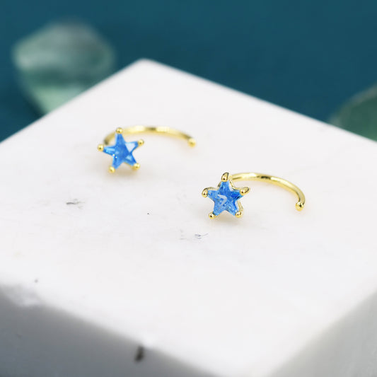 Aquamarine Blue CZ Star Huggie Hoop Earrings in Sterling Silver, Tiny Blue Star CZ Trio Open Hoops, Pull Through Threaders, Half Hoops