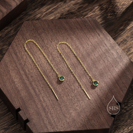 4mm Emerald Green CZ Threader Earrings in Sterling Silver, Silver or Gold, Tiny Dot Crystal Ear Threaders, Bezel CZ Ear Threaders