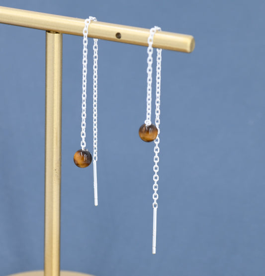 Genuine Tiger's Eye Gemstone Threader Earrings in Sterling Silver, 8cm Ear Threaders, Natural Semi Precious Gemstone Ear Threaders