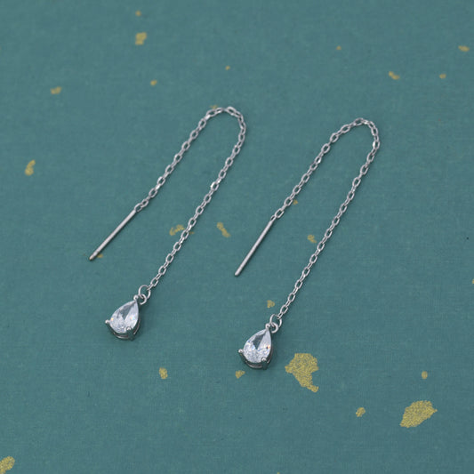CZ Droplet Threader Earrings in Sterling Silver, Silver or Gold, Pear Cut 4x6mm CZ Long Ear Threaders, Sparkly CZ Threaders,